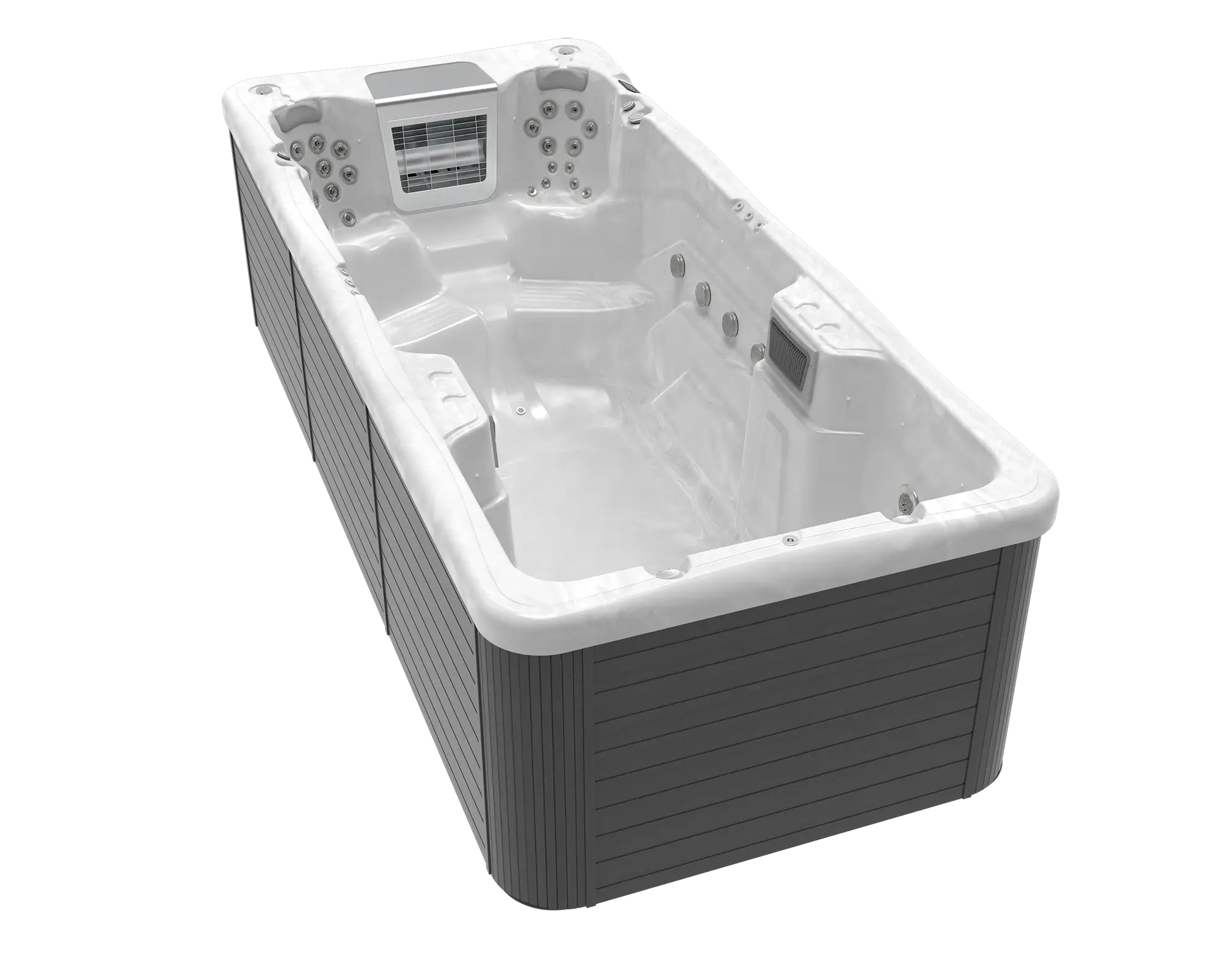 Das Modell Amazonas swim spa ist für Schwimmbegeisterte gedacht. Entscheiden Sie sich für unser Amazonas-Schwimmbecken für Ihr Zuhause, ein Produkt, das in einem das perfekte Werkzeug für ein Training am Nachmittag und einen Ort zum Entspannen mit Ihren Kindern verkörpert. Und mit dem W-Flow-System können Sie individuelle Trainingsprogramme einrichten, die Ihren Vorlieben entsprechen. Mit einer Breite von fast 2,5 m und einer Länge von 5,5 m bietet er ein repräsentatives Aussehen und ein modernes Design. Dank der Halbschrankbauweise müssen Sie sich nicht um die sehr kostspieligen und zeitaufwändigen Installationsarbeiten kümmern, sondern können den Pool einfach nur benutzen.